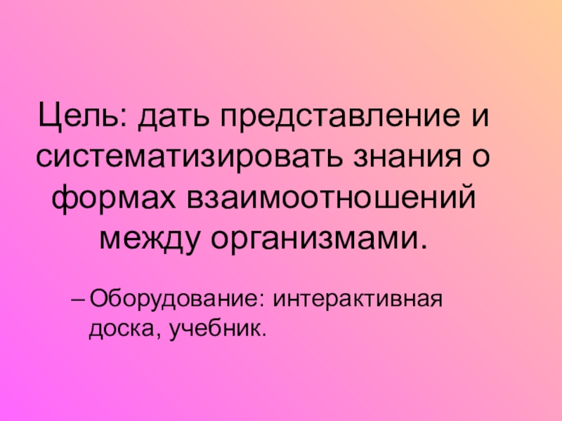 Цель: дать представление и систематизировать знания о формах взаимоотношений между организмами.  Оборудование: интерактивная доска, учебник.