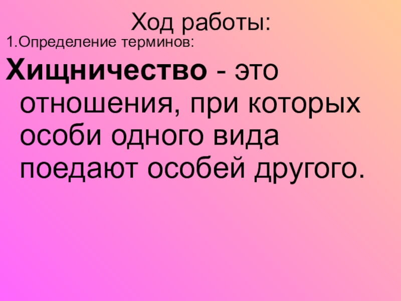 Ход работы:1.Определение терминов:Хищничество - это отношения, при которых особи одного вида поедают особей другого.
