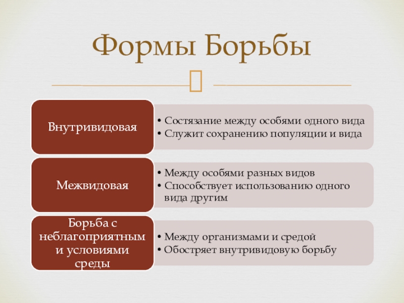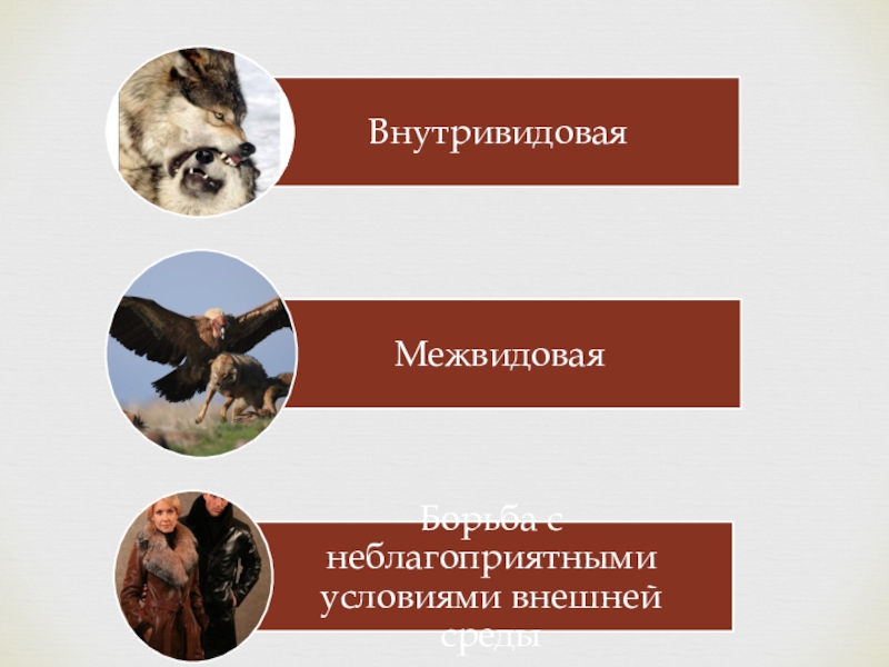 Борьба за существование – это внутривидовые и межвидовые отношения, а также взаимоотношения организмов с факторами среды.