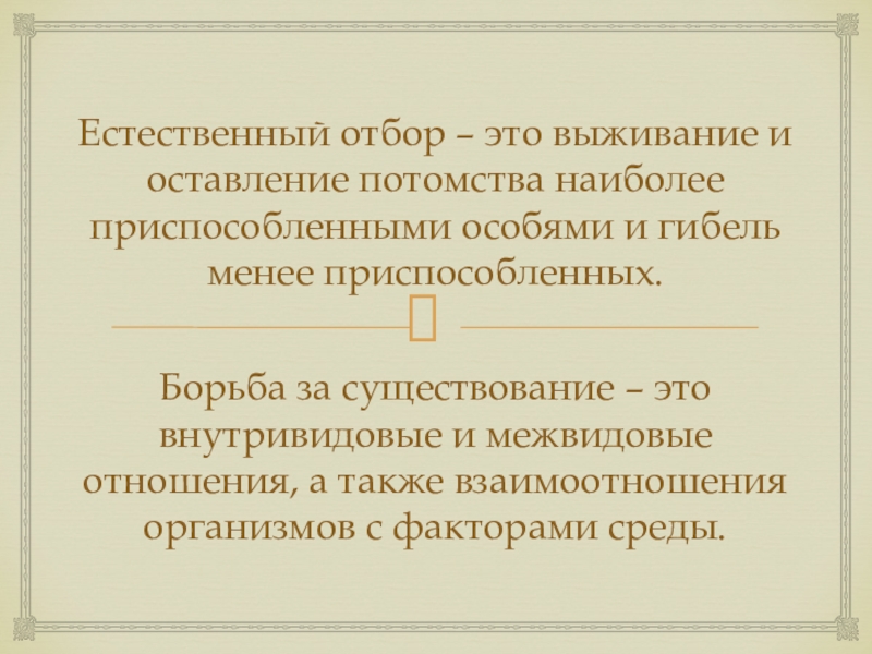 Естественный отбор – это выживание и оставление потомства наиболее приспособленными особями и гибель менее приспособленных.Борьба за существование – это внутривидовые и межвидовые отношения, а также взаимоотношения организмов с факторами среды.