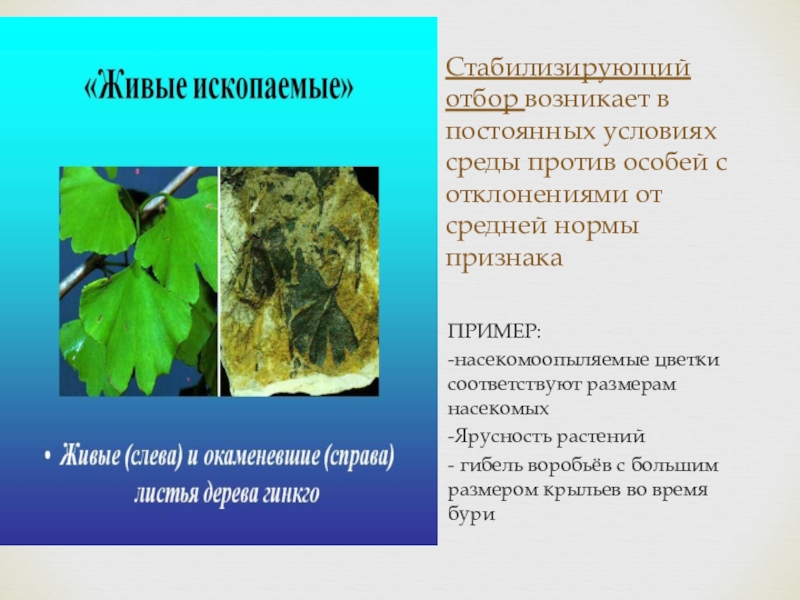 Стабилизирующий отбор возникает в постоянных условиях среды против особей с отклонениями от средней нормы признакаПРИМЕР: -насекомоопыляемые цветки