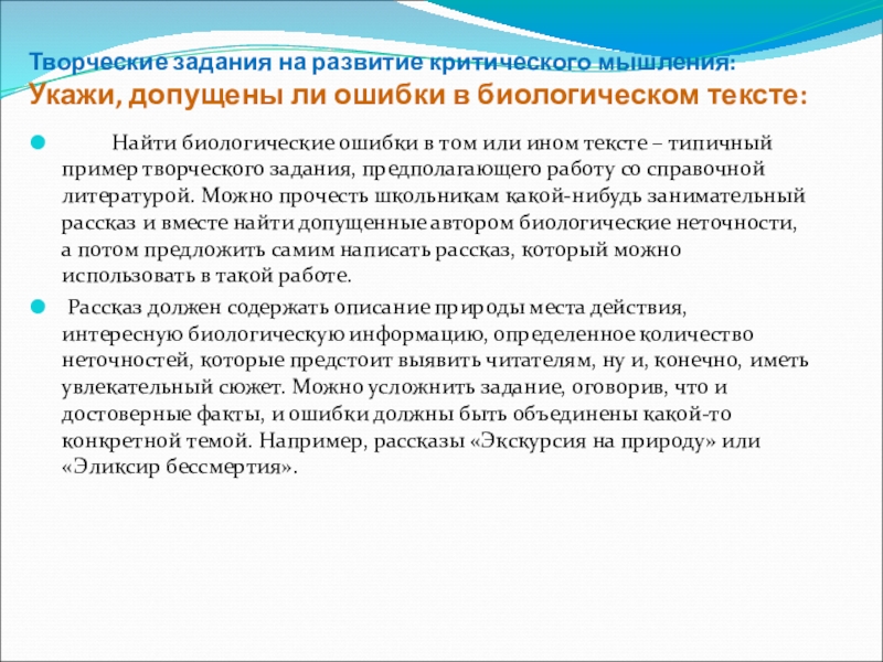 Найти биологические ошибки в том или ином тексте – типичный пример творческого задания, предполагающего работу со справочной литературой. Можно прочесть школьникам какой-нибудь занимательный рассказ и вместе найти допущенные автором биологические неточности, а потом предложить самим написать рассказ, который можно использовать в такой работе.