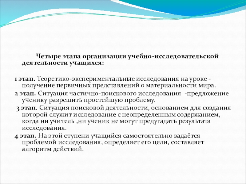 4 этап. На этой ступени учащийся самостоятельно задаётся проблемой исследования, определяет его цели, составляет алгоритм действий.