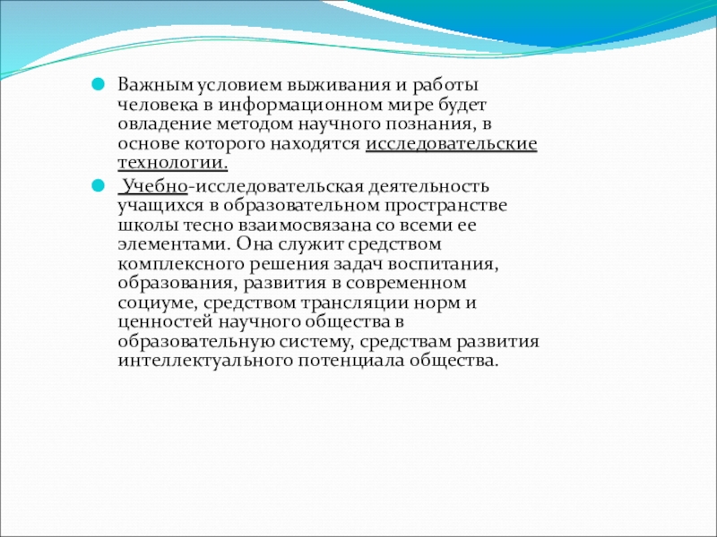 Учебно-исследовательская деятельность учащихся в образовательном пространстве школы тесно взаимосвязана со всеми ее элементами. Она служит средством комплексного решения задач воспитания, образования, развития в современном социуме, средством трансляции норм и ценностей научного общества в образовательную систему, средствам развития интеллектуального потенциала общества.