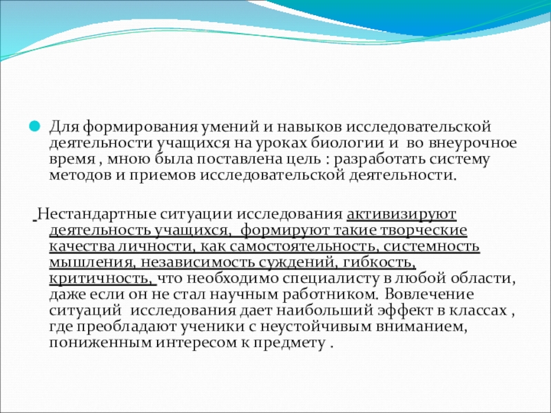 биологии и во внеурочное время , мною была поставлена цель : разработать систему методов и приемов исследовательской деятельности.