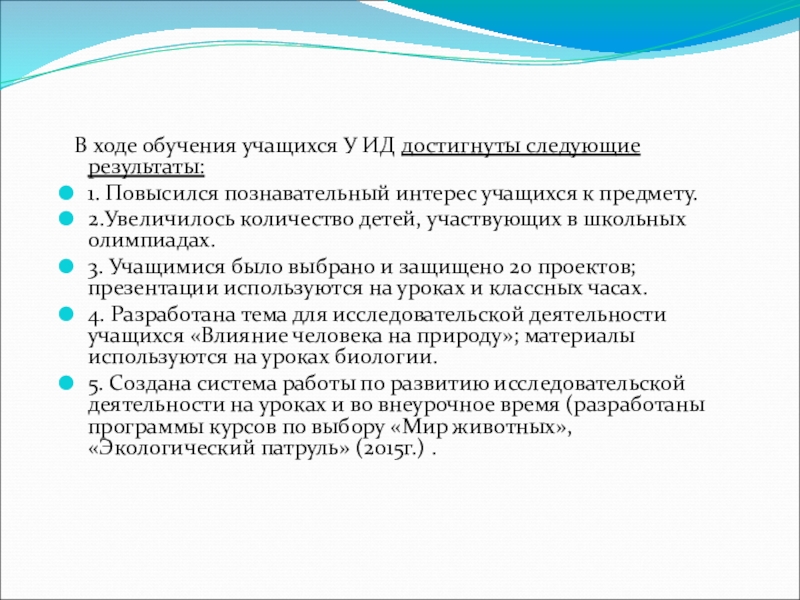 5. Создана система работы по развитию исследовательской деятельности на уроках и во внеурочное время (разработаны программы курсов по выбору «Мир животных», «Экологический патруль» (2015г.) .