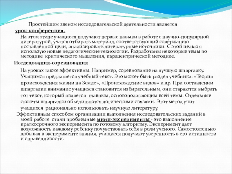 На этом этапе учащиеся получают первые навыки в работе с научно-популярной литературой, учатся отбирать материал, соответствующий содержанию поставленной цели, анализировать литературные источники. С этой целью я использую новые педагогические технологии. Разработаны некоторые темы по методике критического мышления, парацентрической методике.