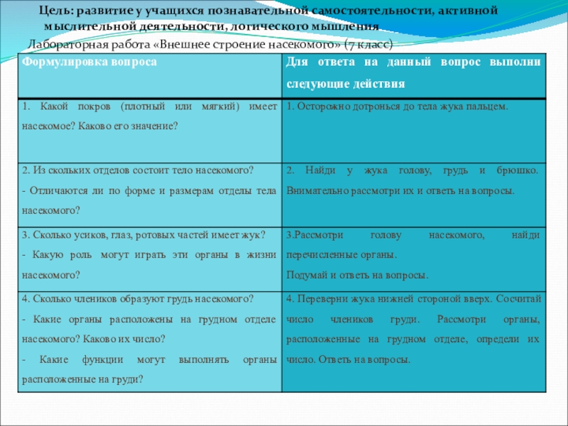 Слайд 14 Цель: развитие у учащихся познавательной самостоятельности, активной мыслительной деятельности, логического мышления