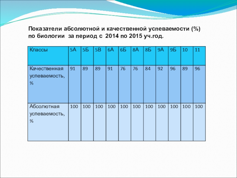 Показатели абсолютной и качественной успеваемости (%) по биологии за период с