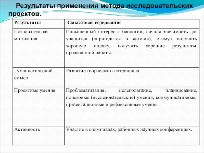 Слайд 17 Результаты применения метода исследовательских проектов.