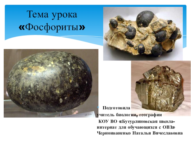 Тема урока «Фосфориты»Подготовила учитель биологии, географии КОУ ВО «Бутурлиновская школа-интернат для обучающихся с ОВЗ» Черноиваненко Наталья Вячеславовна