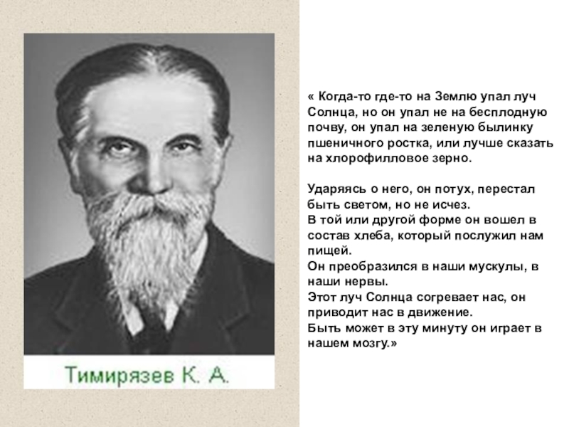 не на бесплодную почву, он упал на зеленую былинку пшеничного ростка, или лучше сказать на хлорофилловое зерно. Ударяясь о него, он потух, перестал быть светом, но не исчез. В той или другой форме он вошел в состав хлеба, который послужил нам пищей. Он преобразился в наши мускулы, в наши нервы. Этот луч Солнца согревает нас, он приводит нас в движение. Быть может в эту минуту он играет в нашем мозгу.»