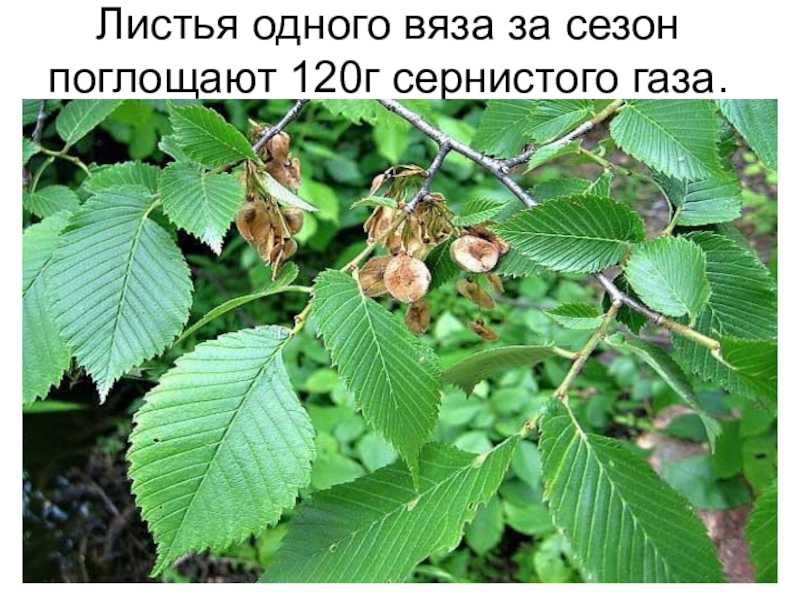 Слайд 30Листья одного вяза за сезон поглощают 120г сернистого газа.