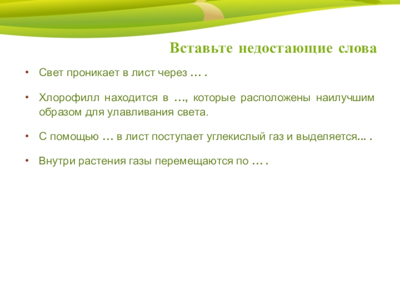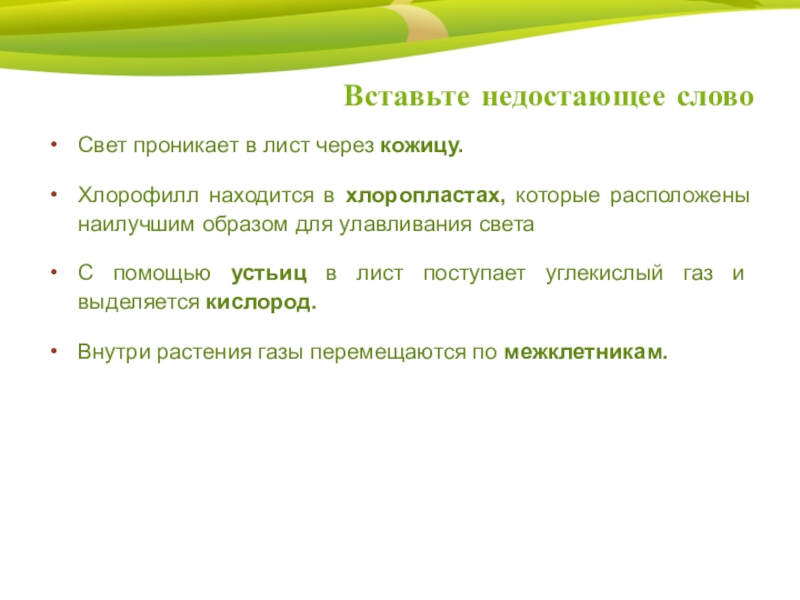 Вставьте недостающее словоСвет проникает в лист через кожицу.Хлорофилл находится в хлоропластах, которые расположены наилучшим образом для улавливания