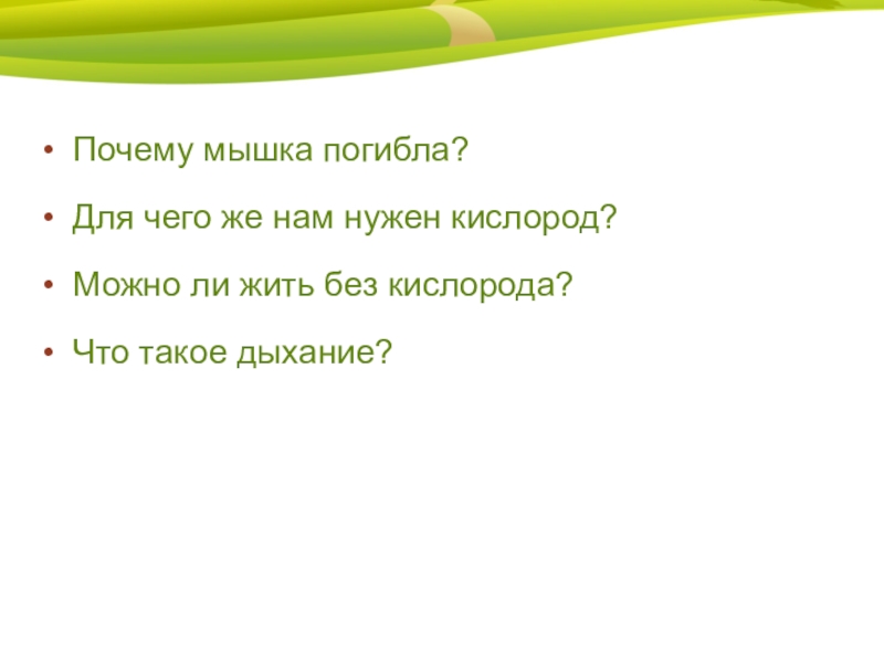 Почему мышка погибла?Для чего же нам нужен кислород?Можно ли жить без кислорода?Что такое дыхание?