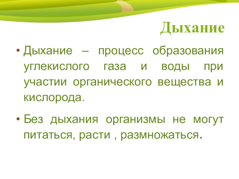 ДыханиеДыхание – процесс образования углекислого газа и воды при участии органического вещества и кислорода.Без дыхания организмы не