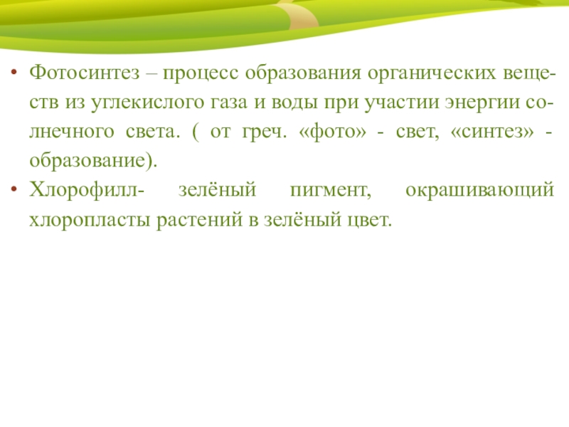 Фотосинтез – процесс образования органических веще-ств из углекислого газа и воды при участии энергии со-лнечного света. (