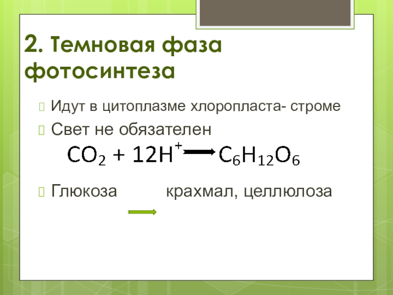 2. Темновая фаза фотосинтезаИдут в цитоплазме хлоропласта- стромеСвет не обязателенГлюкоза     крахмал, целлюлоза