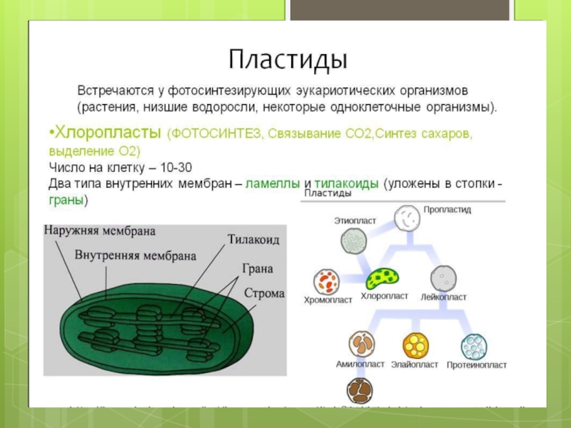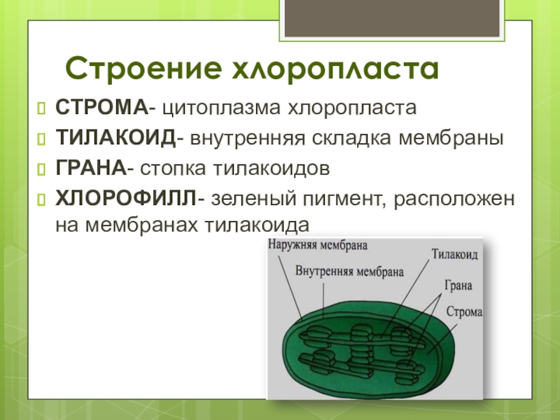Строение хлоропластаСТРОМА- цитоплазма хлоропластаТИЛАКОИД- внутренняя складка мембраныГРАНА- стопка тилакоидовХЛОРОФИЛЛ- зеленый пигмент, расположен на мембранах тилакоида