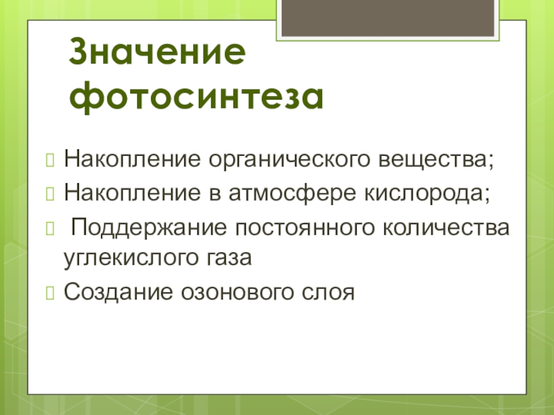 Значение фотосинтезаНакопление органического вещества;Накопление в атмосфере кислорода; Поддержание постоянного количества углекислого газаСоздание озонового слоя