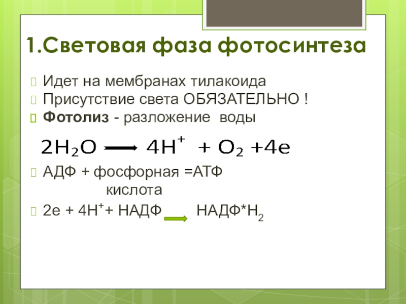 1.Световая фаза фотосинтезаИдет на мембранах тилакоидаПрисутствие света ОБЯЗАТЕЛЬНО !Фотолиз - разложение водыАДФ + фосфорная =АТФ