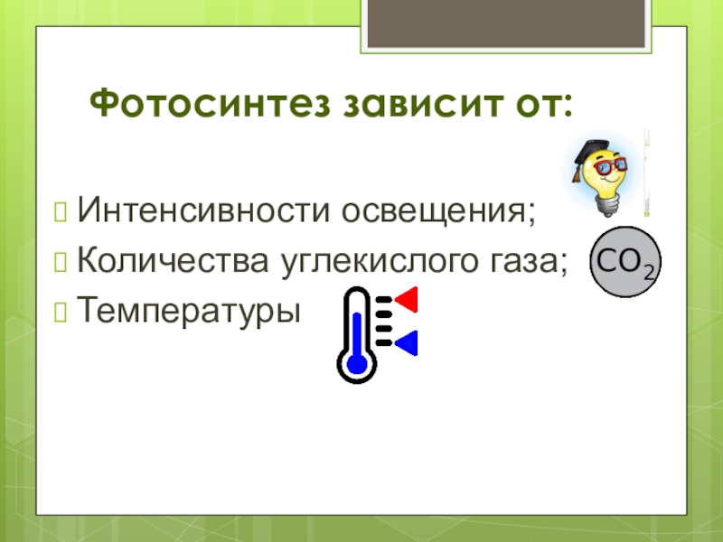 Фотосинтез зависит от:Интенсивности освещения;Количества углекислого газа;Температуры