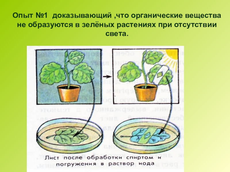 Слайд 17Опыт №1 доказывающий ,что органические вещества не образуются в зелёных растениях