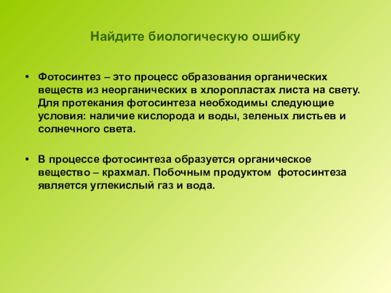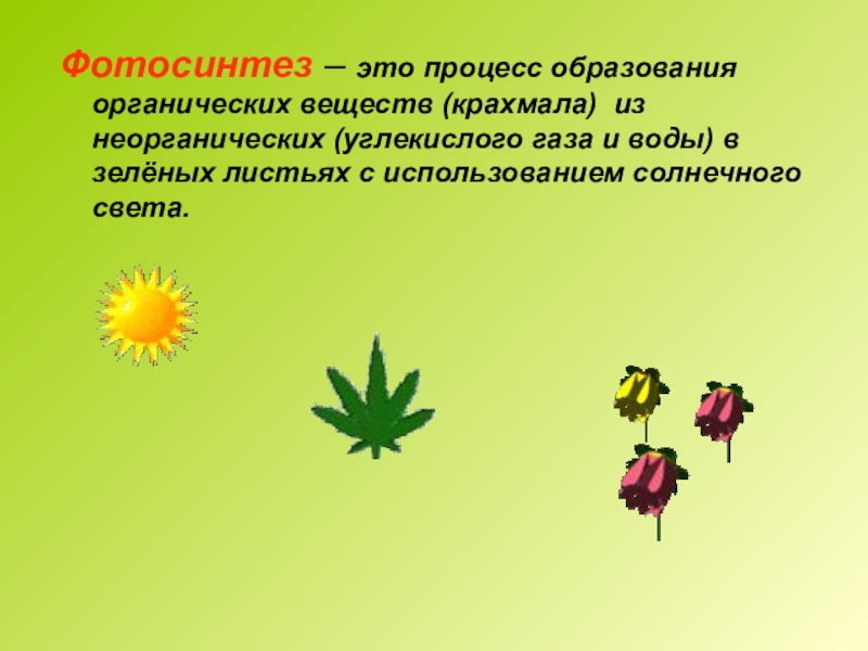 Слайд 10Фотосинтез – это процесс образования органических веществ (крахмала) из неорганических (углекислого