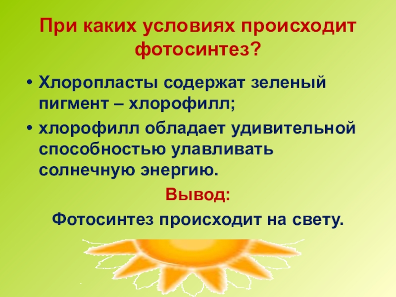 в хлоропластах листа на свету. Для протекания фотосинтеза необходимы следующие условия: наличие кислорода и воды, зеленых листьев и солнечного света.