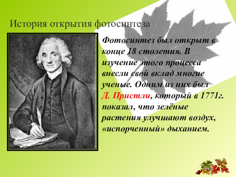 этого процесса внесли свой вклад многие ученые. Одним из них был Д. Пристли, который в 1771г. показал, что зелёные растения улучшают воздух, «испорченный» дыханием.