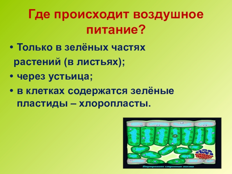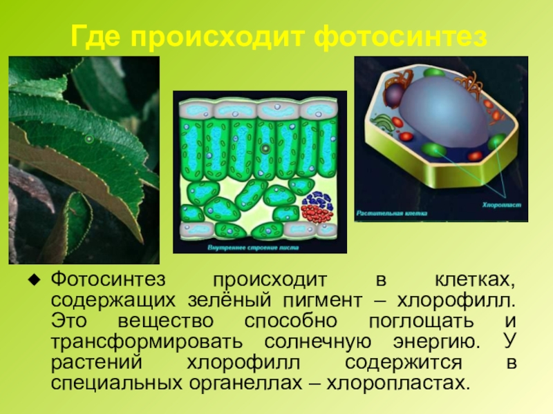 Фотосинтез происходит в клетках, содержащих зелёный пигмент – хлорофилл.
