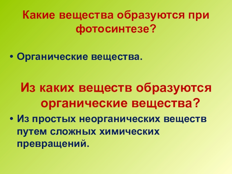 Слайд 9Какие вещества образуются при фотосинтезе?