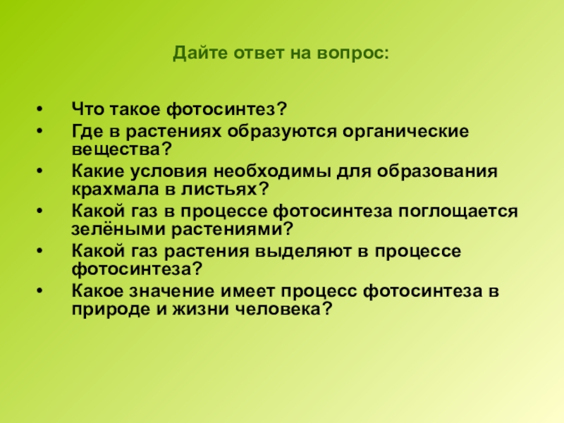 Какой газ в процессе фотосинтеза поглощается зелёными растениями?