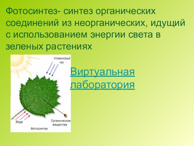 Слайд 12Фотосинтез- синтез органических соединений из неорганических, идущий с использованием энергии света