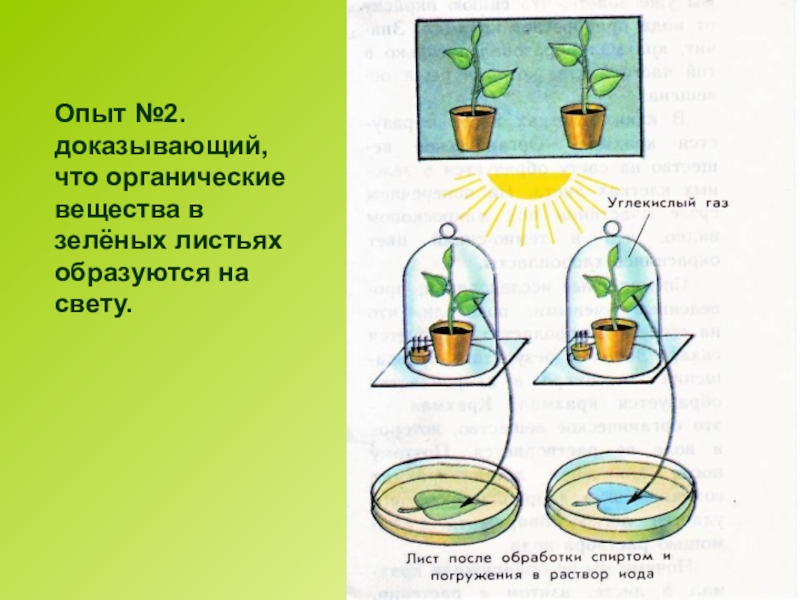 Слайд 18Опыт №2. доказывающий, что органические вещества в зелёных листьях образуются на