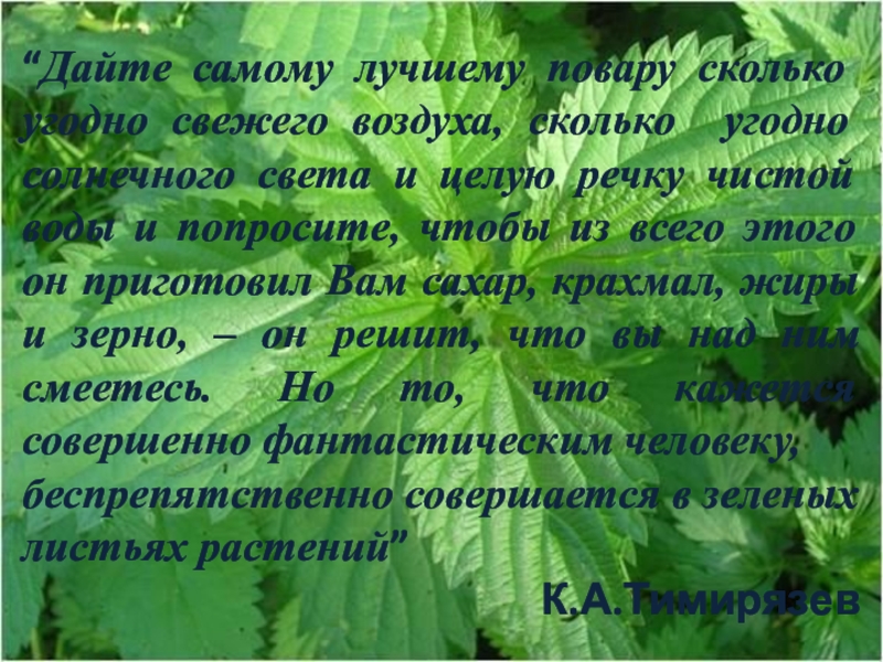 «все соединения углерода в растениях образуются из СО2, который под влиянием света разлагается с выделением О2»
