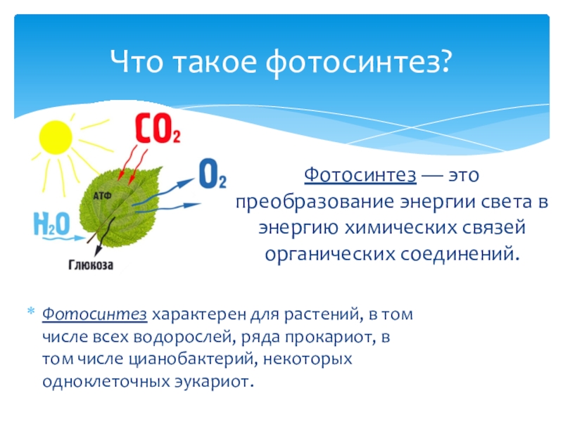 Фотосинтез характерен для растений, в том числе всех водорослей, ряда прокариот, в том числе цианобактерий, некоторых одноклеточных эукариот.