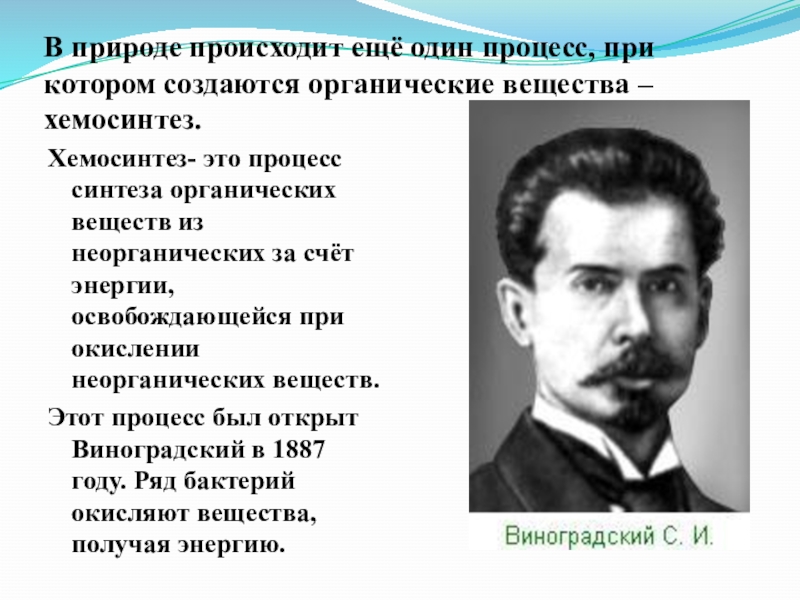 Этот процесс был открыт Виноградский в 1887 году. Ряд бактерий окисляют вещества, получая энергию.