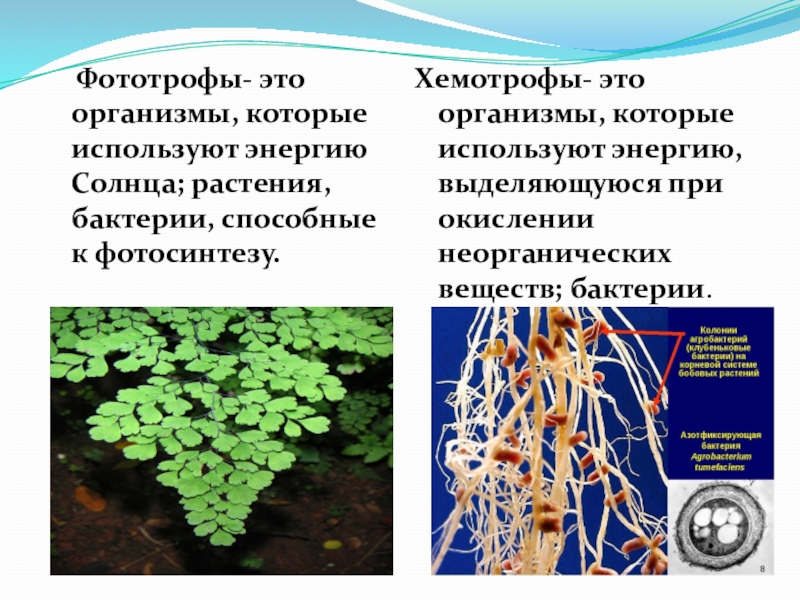 Хемотрофы- это организмы, которые используют энергию, выделяющуюся при окислении неорганических веществ; бактерии.