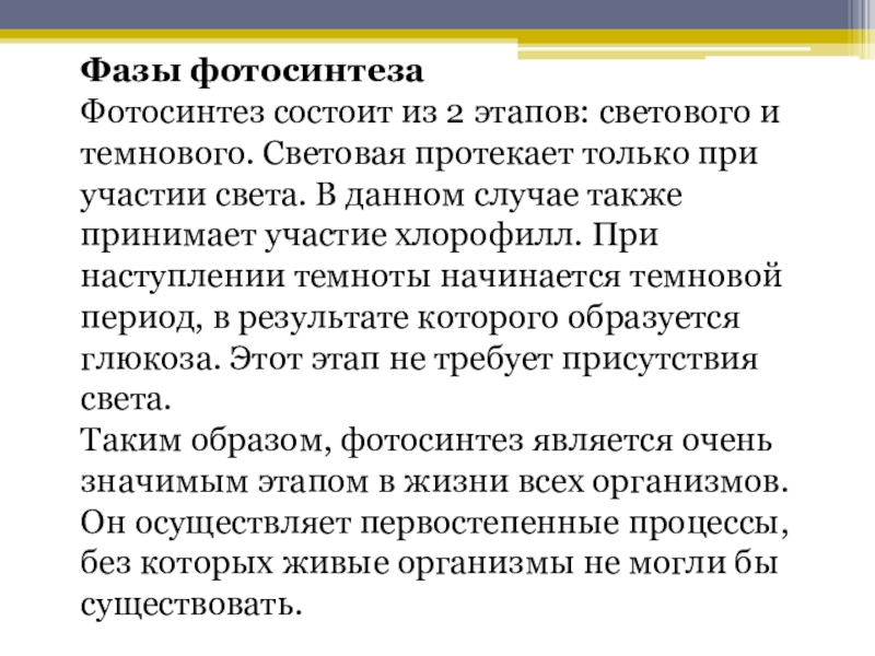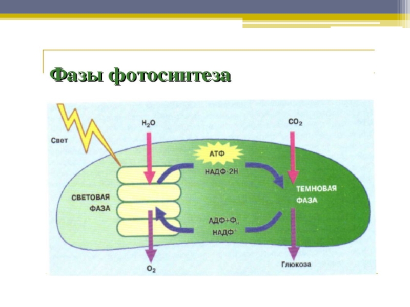 Фазы фотосинтезаФотосинтез состоит из 2 этапов: светового и темнового. Световая протекает только при участии света. В данном