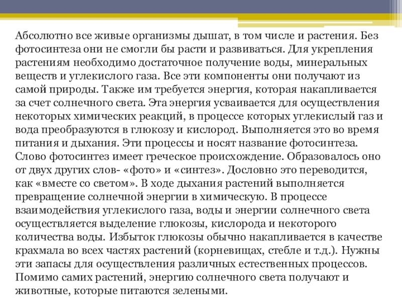 Слово фотосинтез имеет греческое происхождение. Образовалось оно от двух других слов- «фото» и «синтез». Дословно это переводится, как «вместе со светом». В ходе дыхания растений выполняется превращение солнечной энергии в химическую. В процессе взаимодействия углекислого газа, воды и энергии солнечного света осуществляется выделение глюкозы, кислорода и некоторого количества воды. Избыток глюкозы обычно накапливается в качестве крахмала во всех частях растений (корневищах, стебле и т.д.). Нужны эти запасы для осуществления различных естественных процессов. Помимо самих растений, энергию солнечного света получают и животные, которые питаются зелеными.