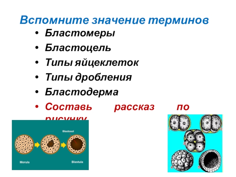 Вспомните значение терминовБластомерыБластоцельТипы яйцеклетокТипы дробленияБластодермаСоставь рассказ по рисунку