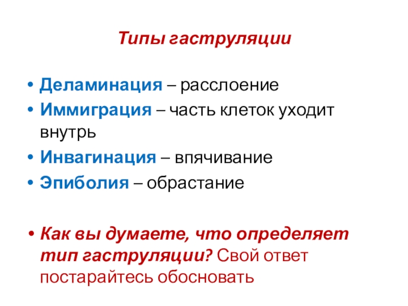 Типы гаструляцииДеламинация – расслоение Иммиграция – часть клеток уходит внутрьИнвагинация – впячиваниеЭпиболия – обрастаниеКак вы думаете, что