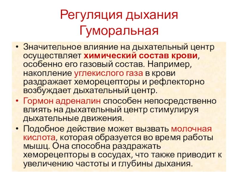 Регуляция дыхания Гуморальная Значительное влияние на дыхательный центр осуществляет химический состав крови, особенно его газовый состав. Например,