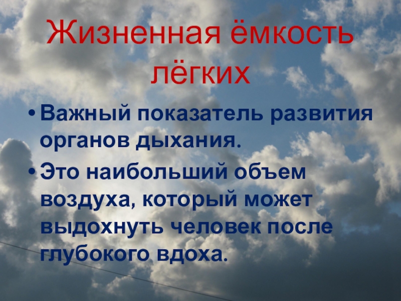 Жизненная ёмкость лёгкихВажный показатель развития органов дыхания.Это наибольший объем воздуха, который может выдохнуть человек после глубокого вдоха.