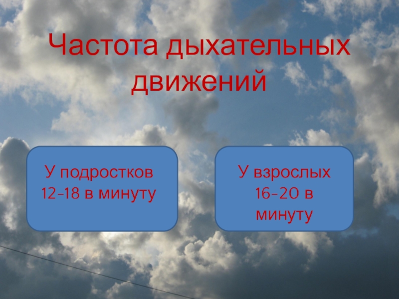 Частота дыхательных движенийУ подростков 12-18 в минутуУ взрослых 16-20 в минуту