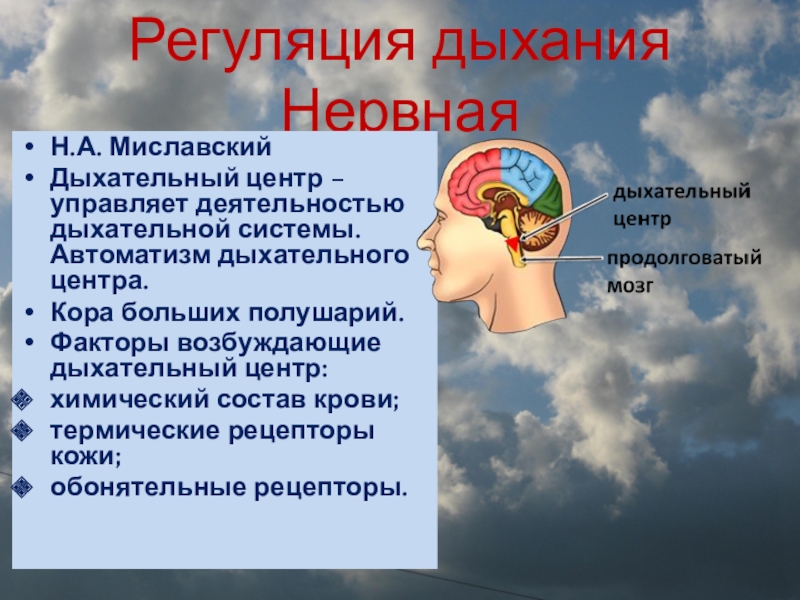 Регуляция дыхания НервнаяН.А. МиславскийДыхательный центр – управляет деятельностью дыхательной системы. Автоматизм дыхательного центра.Кора больших полушарий.Факторы возбуждающие дыхательный