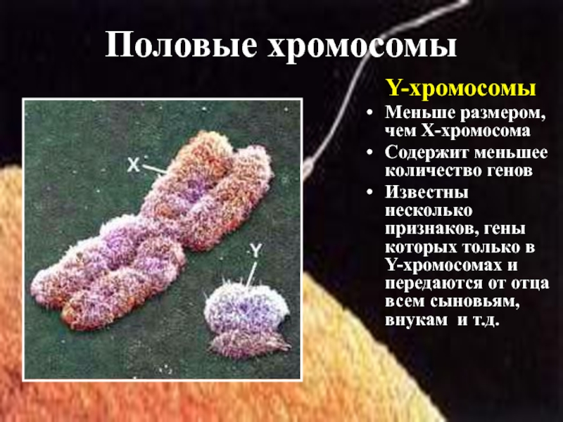 Y-хромосомыМеньше размером, чем Х-хромосомаСодержит меньшее количество геновИзвестны несколько признаков, гены которых только в Y-хромосомах и передаются от