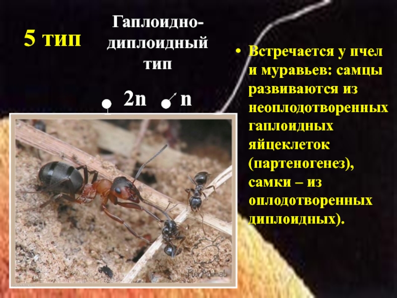 5 типВстречается у пчел и муравьев: самцы развиваются из неоплодотворенных гаплоидных яйцеклеток (партеногенез), самки – из оплодотворенных