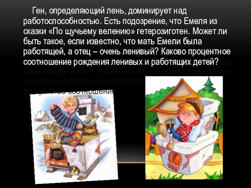 Слайд 7 Ген, определяющий лень, доминирует над работоспособностью. Есть подозрение, что